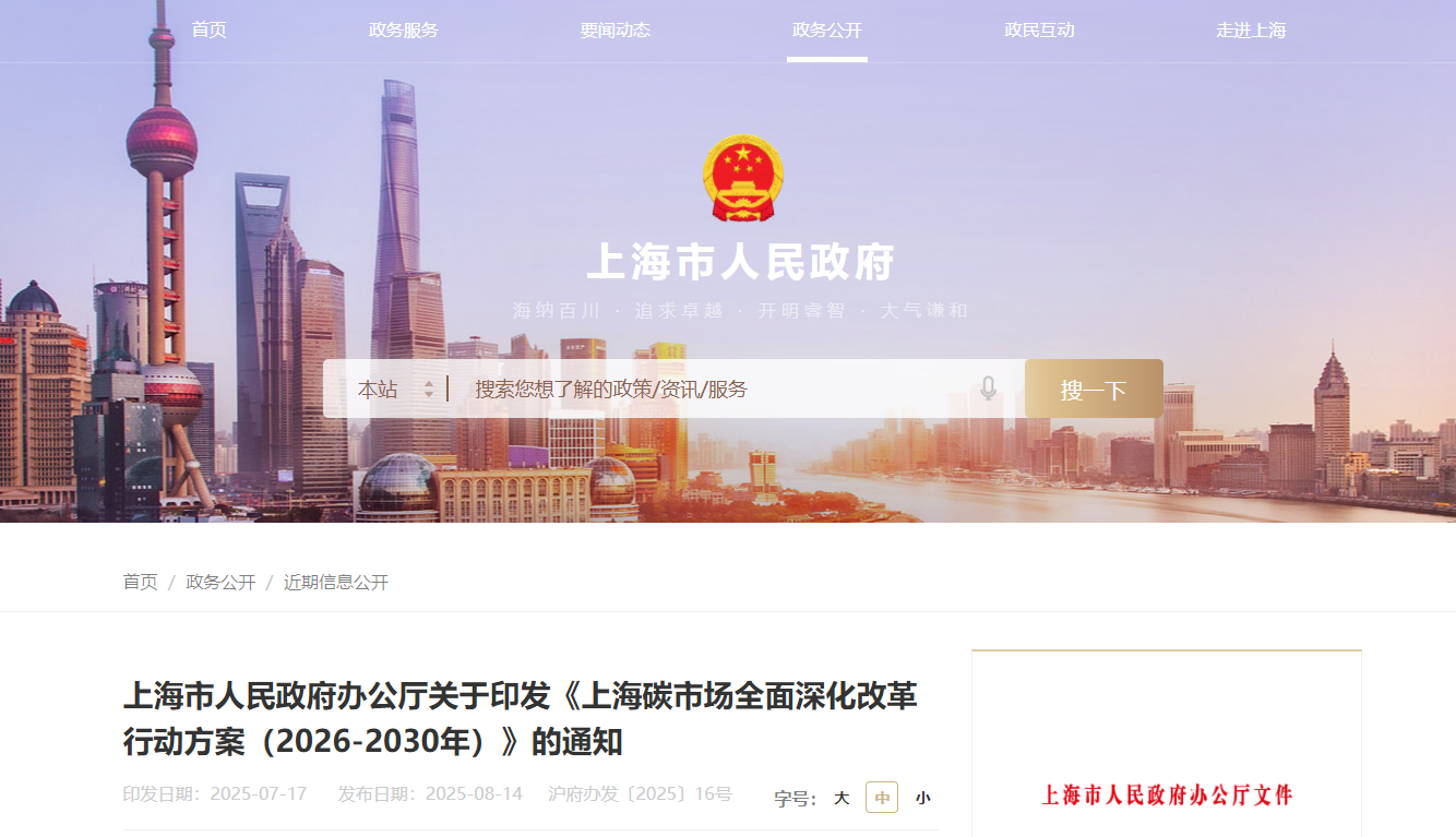 8月14日,上海市人民政府发布关于印发《上海碳市场全面深化改革行动方案(2026-2030年)》(以下简称《方案》)的通知。