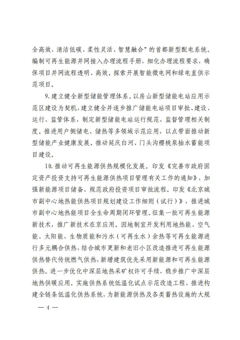 8月15日,北京市发展和改革委员会公开征求《北京市可再生能源开发利用条例实施方案(征求意见稿)》意见。《方案》提到,以房山新型储能电站应用示范区建设为契机,建立健全并逐步推广储能电站项目审批、建设、运行、监管体系,制定新型储能电站运行规范、监督管理相关制度。推进用户侧储电、储热等多领域示范应用,以点带面推动新型储能产业健康发展。推动延庆白河、门头沟樱桃泉抽水蓄能项目建设。组织开展氢能、储能等国家重点研发计划申报。印发实施《北京市绿色先进能源和低碳环保产业发展实施方案》,支持光伏、风电、地热、污水(可再生水)余热、新型储能、氢能、智能电网等符合区域产业布局的可再生能源产业发展,推动完善上下游产业链、供应链,支持建设综合性、专业性的可再生能源产业集聚地和应用示范区。深化新型电力系统建设。制定《北京市新型电力系统建设实施方案》,构建坚强智能电网,提升电力系统灵活调节能力。推进本市配电网高质量发展,开展本市分布式电源接入电网承载力及提升措施评估,建立配电网可开放容量按季度发布机制,定期公布并网接入技术标准规范、典型设计方案等信息,打造“安全高效清洁低碳、柔性灵活、智慧融合”的首都新型配电系统。编制可再生能源并网接入办理流程手册,细化办理流程要求,确保项目并网流程透明、高效。探索开展智能微电网和绿电直供示范项目。 原文如下:
