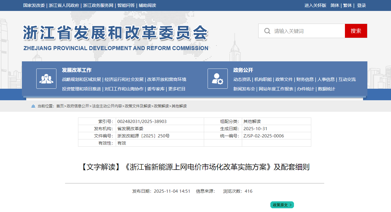 11月4日,浙江省发展改革委发布关于印发《浙江省新能源上网电价市场化改革实施方案》及配套细则的通知,文件明确自2026年1月1日起施行...